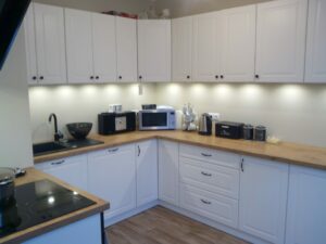 Kuchnia na wymiar – klasyczna biel z drewnianym blatem