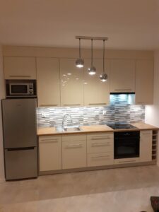 Ta kuchnia powstała z myślą o maksymalnym wykorzystaniu przestrzeni – praktyczne rozwiązania idą tu w parze z estetyką.. Fronty w jasnym, połyskującym wykończeniu nadają przestrzeni elegancji i lekkości, a drewnopodobny blat wprowadza przytulny, naturalny akcent.
