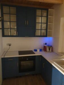 Zabudowa została wykonana na wymiar, aby maksymalnie wykorzystać dostępną przestrzeń i stworzyć ergonomiczną strefę kuchenną. Połączenie granatowych frontów MDF lakierowanych z eleganckimi przeszkleniami nadaje wnętrzu wyjątkowego charakteru i podkreśla nowoczesny styl aranżacji.