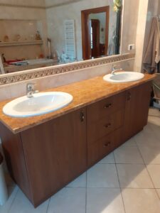 Szafka łazienkowa z blatem kamiennym i podwójną umywalką